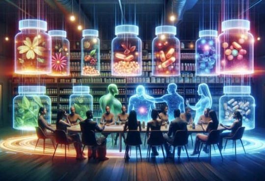 A diverse group sharing supplement experiences in a cozy setting, with reviews on an interactive wall.