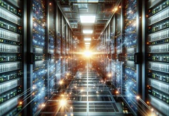 Futuristic server room with glowing bare-metal servers, symbolizing enhanced performance in trading and streaming.